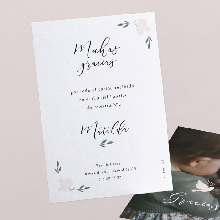Agradece a tus seres queridos que rodearon a tu hijo en su bautizo con una bonita tarjeta de agradecimiento a juego con la invitación de este gran día.