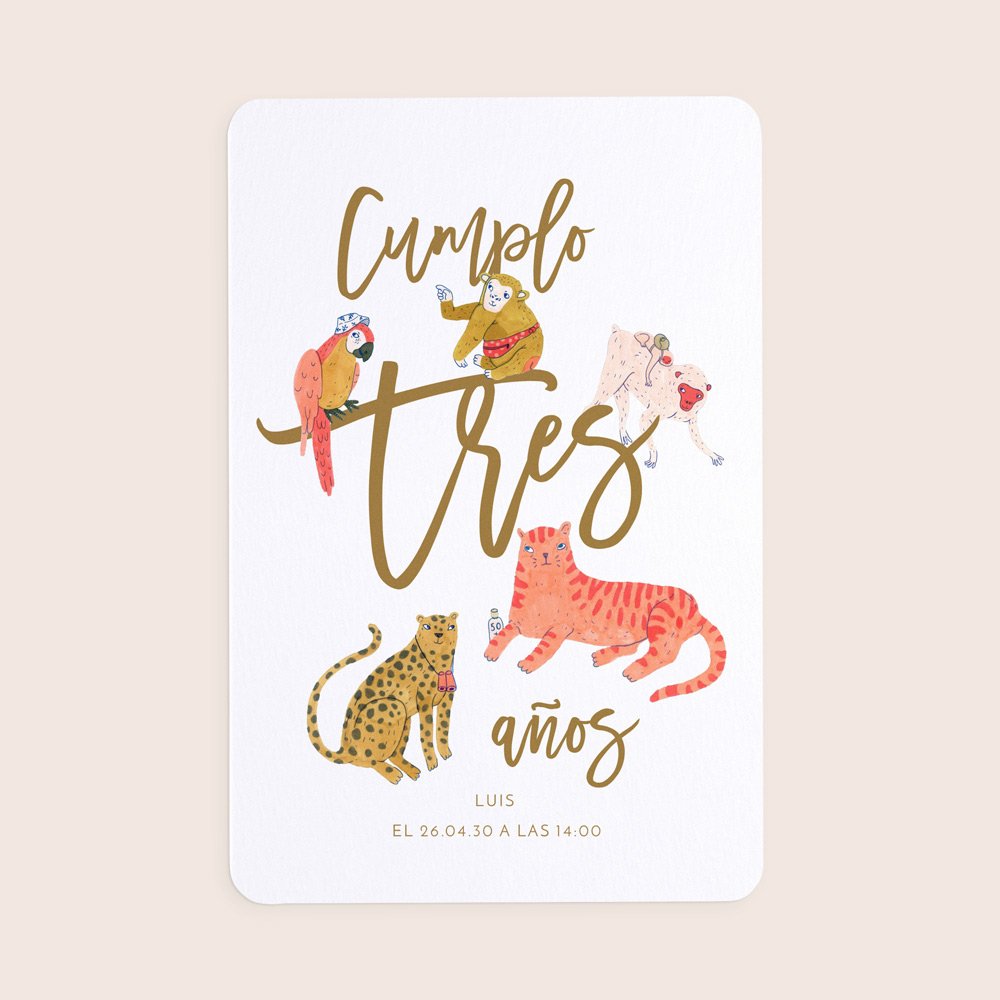 Con sus animales exóticos ilustrados en una paleta de oro y coral, la tarjeta de invitación Amazonia es ideal para un tema de cumpleaños Jungle Chic con un toque original.