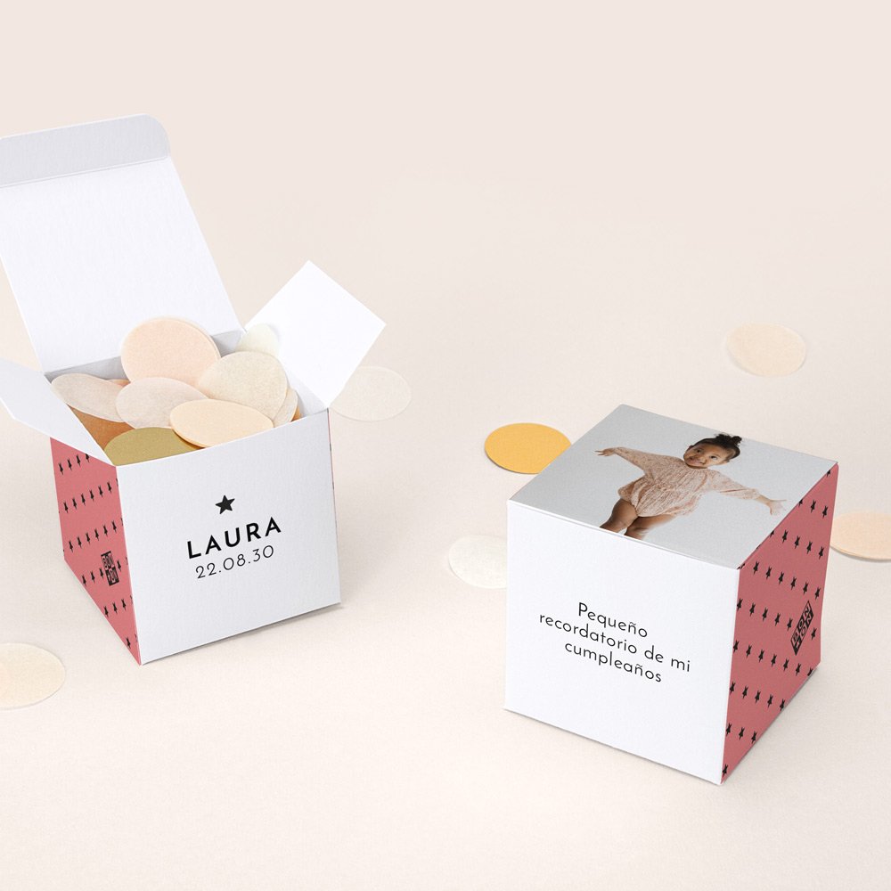 Un surtido de caramelos u otras golosinas, figuritas, abalorios y bisutería..., utiliza tu creatividad para llenar la cajita de detalles y personalízalo con el nombre de tu hijo y otra información que desees de su cumpleaños (fecha, edad, etc.), así como, por ejemplo, una nota de agradecimiento.