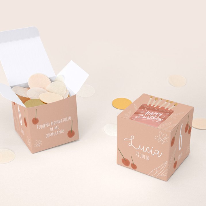 Asegúrate de que los invitados se marchen con un bello recuerdo del cumpleaños que han celebrado regalándoles un pequeño cubo sorpresa Cherrycake