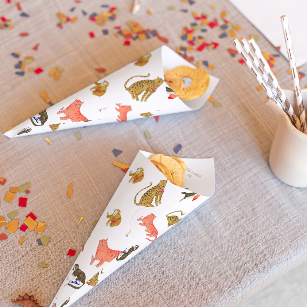 Serpentinas, matasuegras y cotillones para un ambiente alegre, muchos lápices de colores para un taller creativo, golosinas (palomitas, nubes de gominola, etc.), detallitos... ¡un sinfín de posibilidades para rellenar tus conos con regalos que harán las delicias de tus invitados!