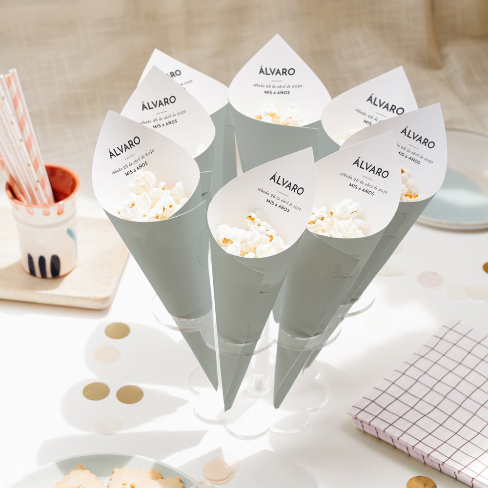 Serpentinas, matasuegras y cotillones para un ambiente alegre, muchos lápices de colores para un taller creativo, golosinas (palomitas, nubes de gominola, etc.), detallitos... ¡un sinfín de posibilidades para rellenar tus conos con regalos que harán las delicias de tus invitados!