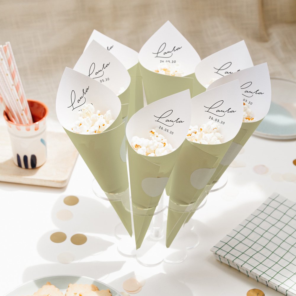 Serpentinas, matasuegras y cotillones para un ambiente alegre, muchos lápices de colores para un taller creativo, golosinas (palomitas, nubes de gominola, etc.), detallitos... ¡un sinfín de posibilidades para rellenar tus conos con regalos que harán las delicias de tus invitados!