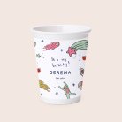 Estos vasos de fibra reciclable incluyen etiquetas autoadhesivas personalizables con el nombre de tu hijo, su edad y la fecha del evento.