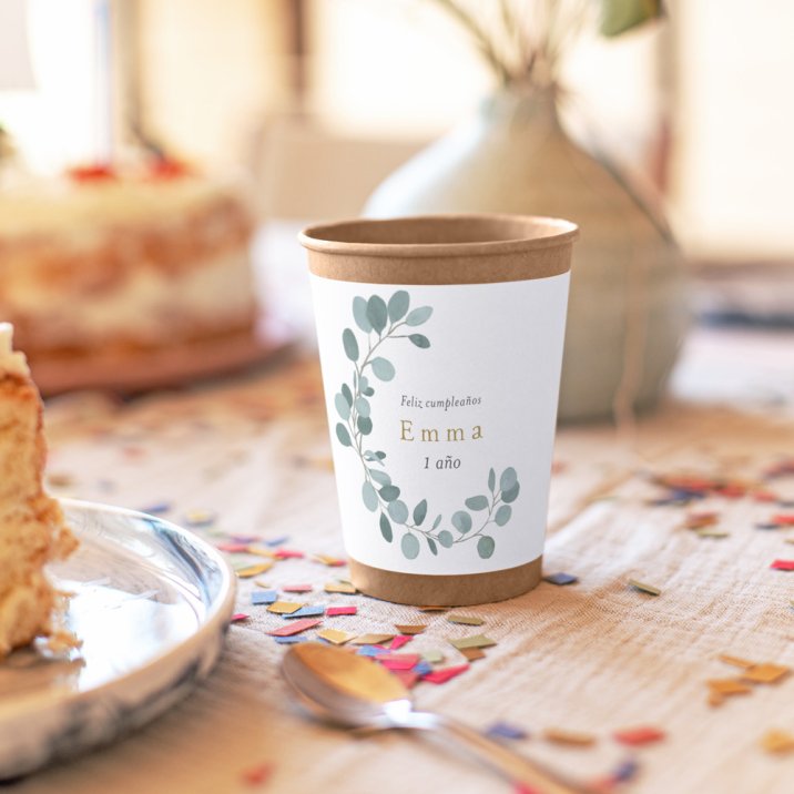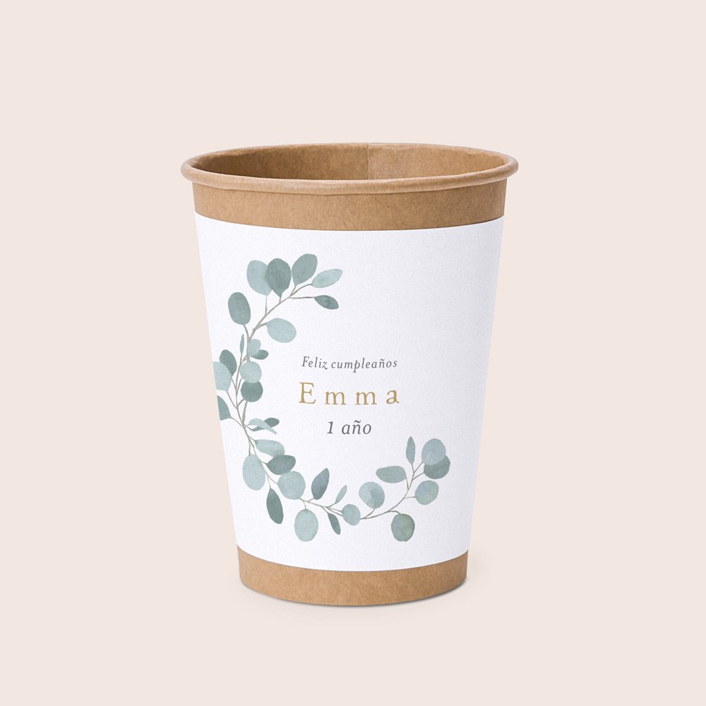 Estos vasos de fibra reciclable incluyen etiquetas autoadhesivas personalizables con el nombre de tu hijo, su edad y la fecha del evento.