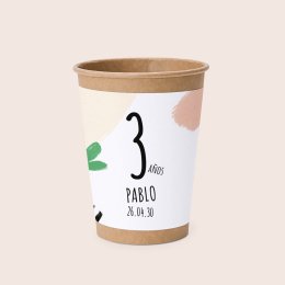 Estos vasos de fibra reciclable incluyen etiquetas autoadhesivas personalizables con el nombre de tu hijo, su edad y la fecha del evento.