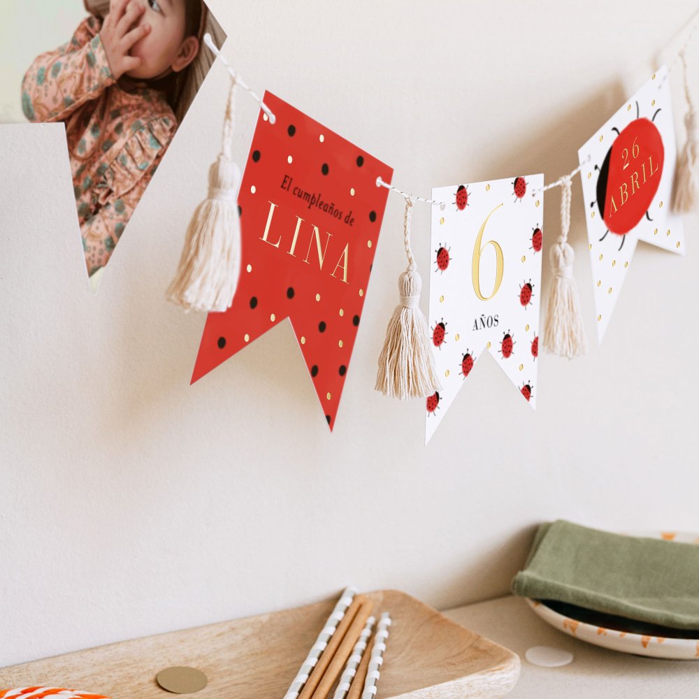 Esta guirnalda de 16 banderines de doble cara, a juego con la invitación elegida, se puede personalizar con el nombre de tu hijo, la fecha de su cumpleaños, su foto y un breve mensaje de celebración.