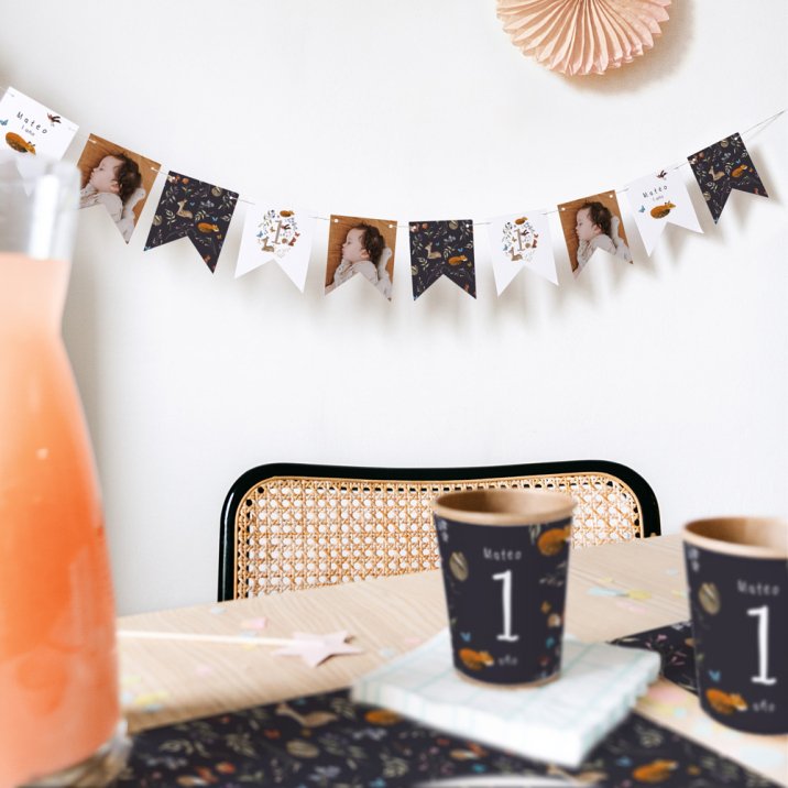 Esta guirnalda de 16 banderines de doble cara, a juego con la invitación elegida, se puede personalizar con el nombre de tu hijo, la fecha de su cumpleaños, su foto y un breve mensaje de celebración.