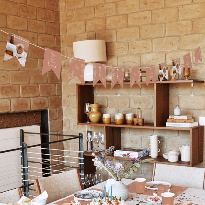 Esta guirnalda de 16 banderines de doble cara, a juego con la invitación elegida, se puede personalizar con el nombre de tu hijo, la fecha de su cumpleaños, su foto y un breve mensaje de celebración.