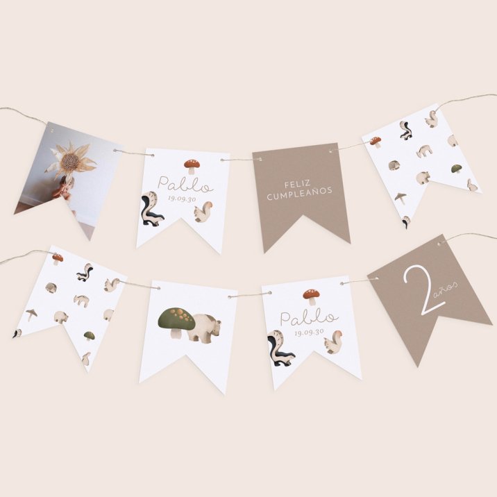 Esta guirnalda de 16 banderines de doble cara, a juego con la invitación elegida, se puede personalizar con el nombre de tu hijo, la fecha de su cumpleaños, su foto y un breve mensaje de celebración.