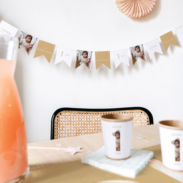 Esta guirnalda de 16 banderines de doble cara, a juego con la invitación elegida, se puede personalizar con el nombre de tu hijo, la fecha de su cumpleaños, su foto y un breve mensaje de celebración.