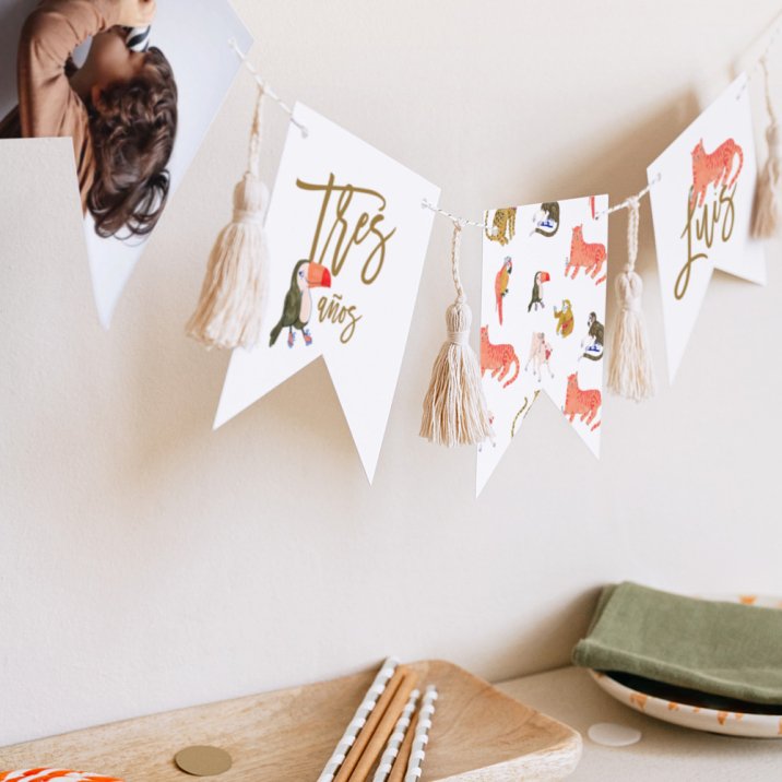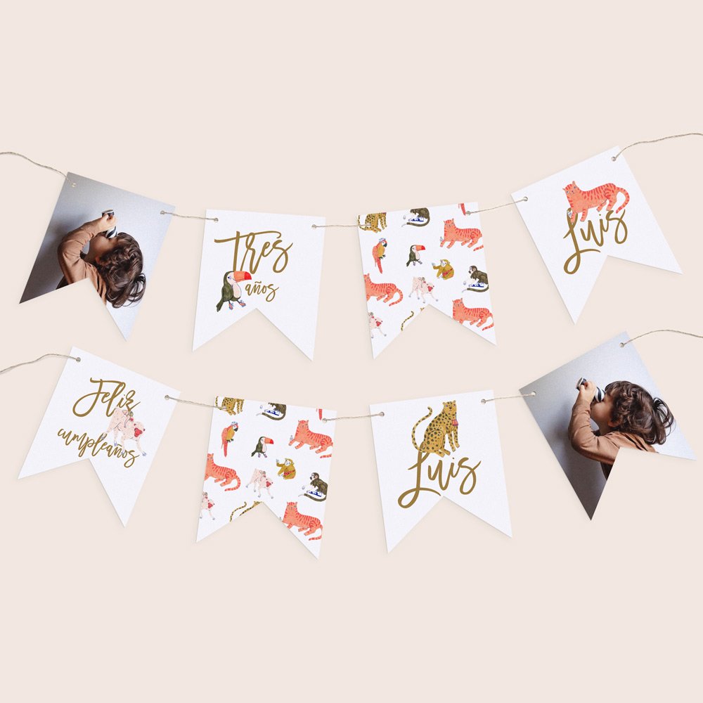 Esta guirnalda de 16 banderines de doble cara, a juego con la invitación elegida, se puede personalizar con el nombre de tu hijo, la fecha de su cumpleaños, su foto y un breve mensaje de celebración.