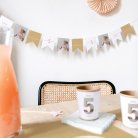 Esta guirnalda de 16 banderines de doble cara, a juego con la invitación elegida, se puede personalizar con el nombre de tu hijo, la fecha de su cumpleaños, su foto y un breve mensaje de celebración.