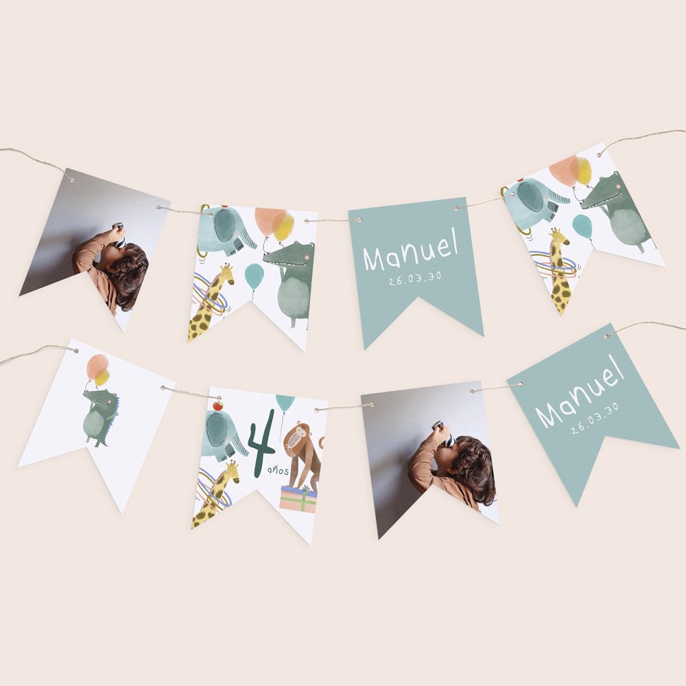 Esta guirnalda de 16 banderines de doble cara, a juego con la invitación elegida, se puede personalizar con el nombre de tu hijo, la fecha de su cumpleaños, su foto y un breve mensaje de celebración.