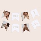 Esta guirnalda de 16 banderines de doble cara, a juego con la invitación elegida, se puede personalizar con el nombre de tu hijo, la fecha de su cumpleaños, su foto y un breve mensaje de celebración.