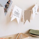 Esta guirnalda de 16 banderines de doble cara, a juego con la invitación elegida, se puede personalizar con el nombre de tu hijo, la fecha de su cumpleaños, su foto y un breve mensaje de celebración.
