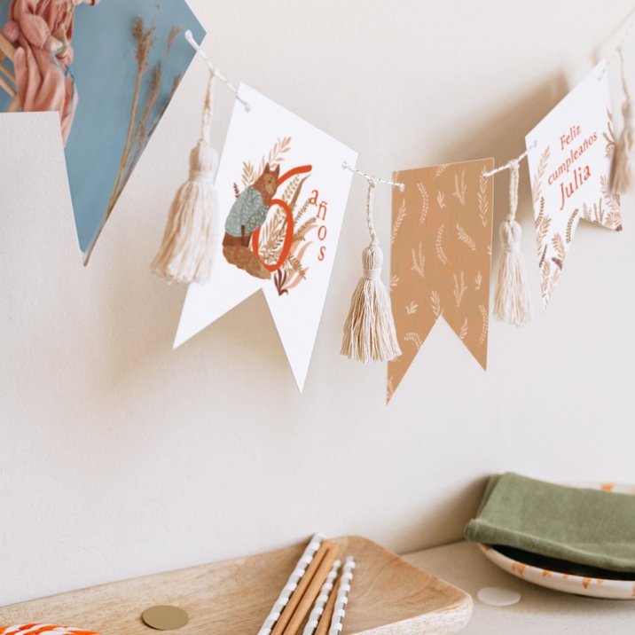 Esta guirnalda de 16 banderines de doble cara, a juego con la invitación elegida, se puede personalizar con el nombre de tu hijo, la fecha de su cumpleaños, su foto y un breve mensaje de celebración.