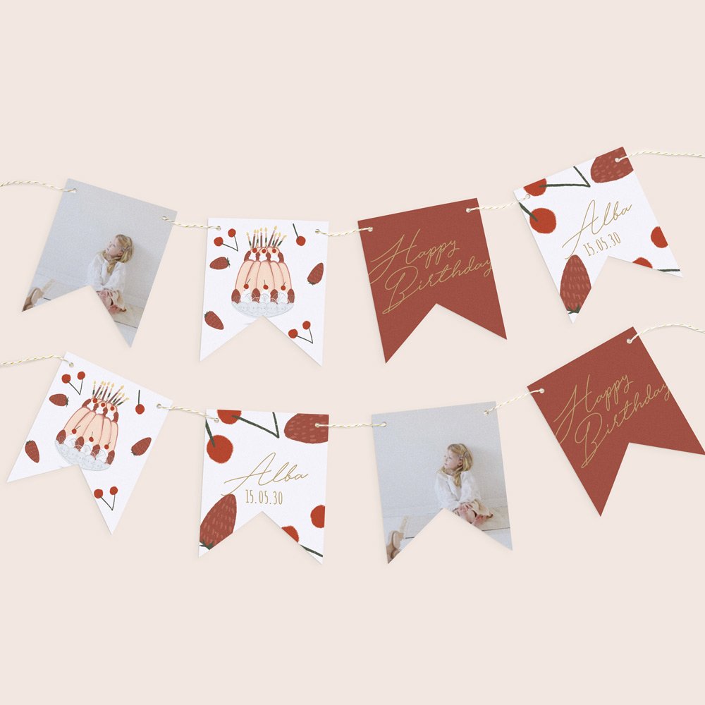 Esta guirnalda de 16 banderines de doble cara, a juego con la invitación elegida, se puede personalizar con el nombre de tu hijo, la fecha de su cumpleaños, su foto y un breve mensaje de celebración.