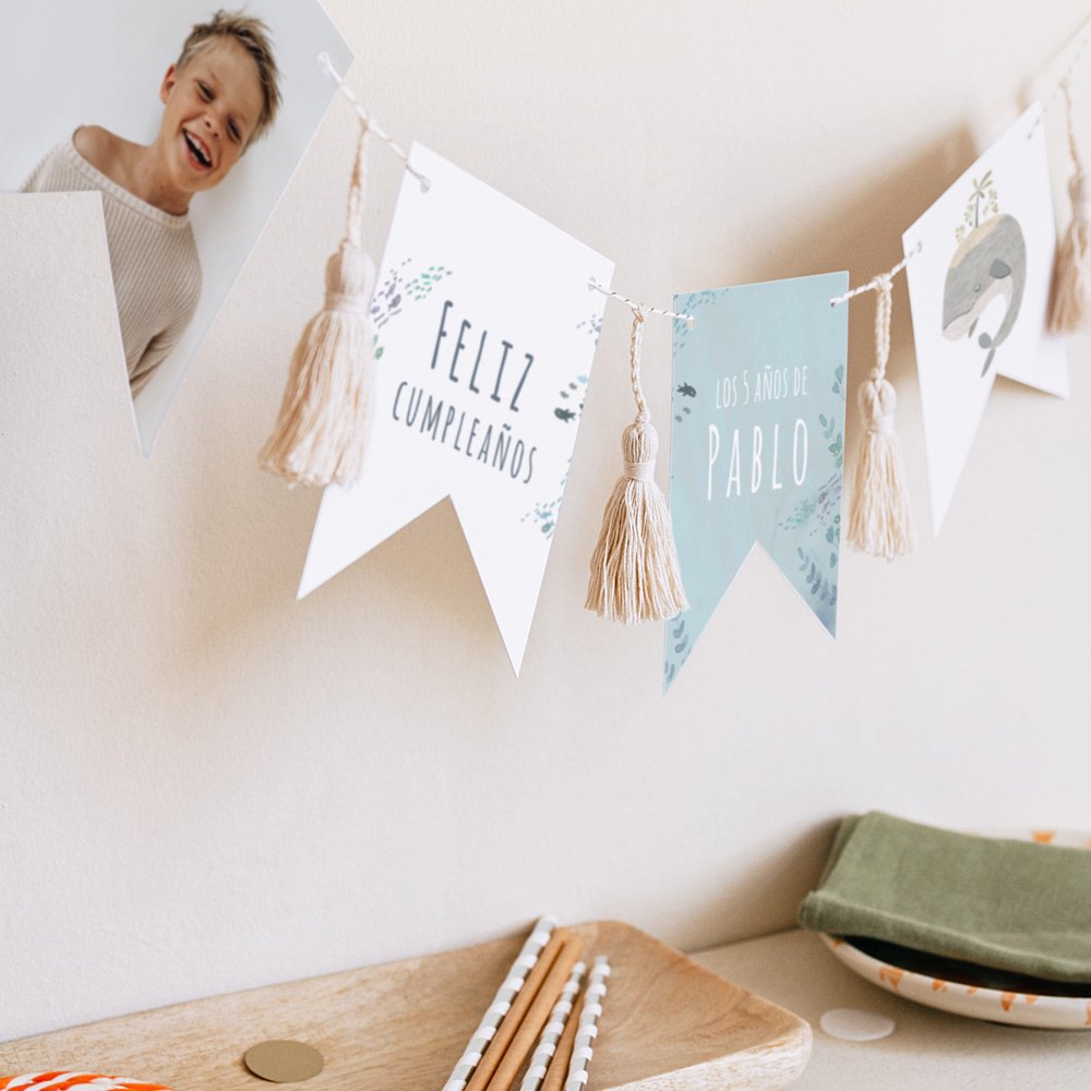Esta guirnalda de 16 banderines de doble cara, a juego con la invitación elegida, se puede personalizar con el nombre de tu hijo, la fecha de su cumpleaños, su foto y un breve mensaje de celebración.