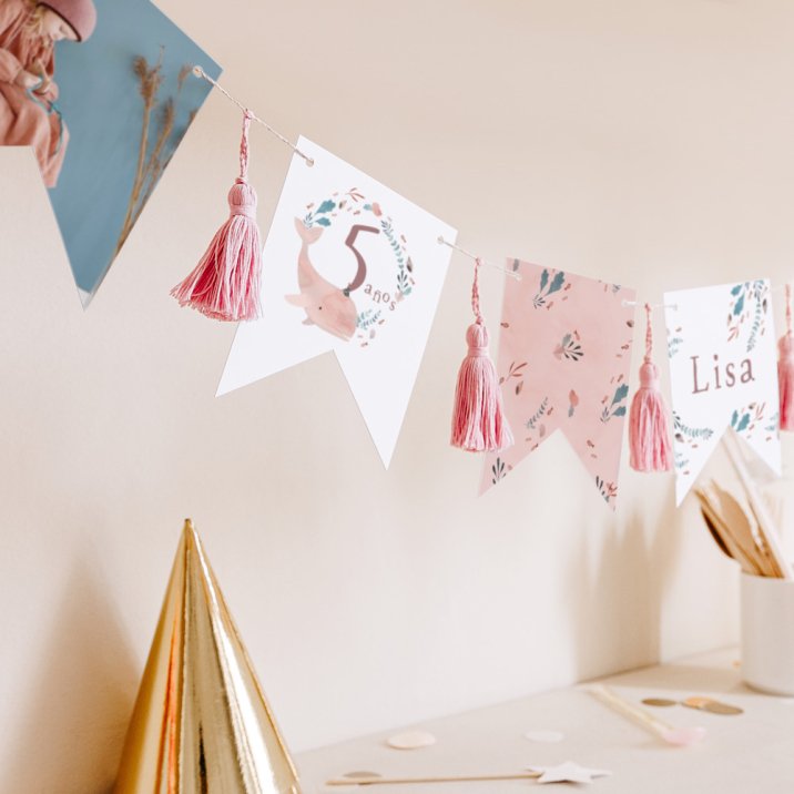 Esta guirnalda de 16 banderines de doble cara, a juego con la invitación elegida, se puede personalizar con el nombre de tu hijo, la fecha de su cumpleaños, su foto y un breve mensaje de celebración.