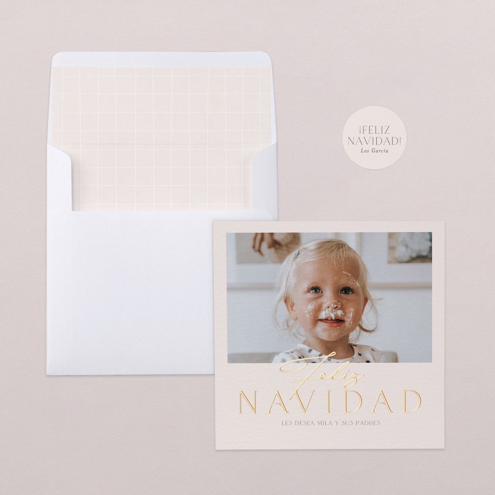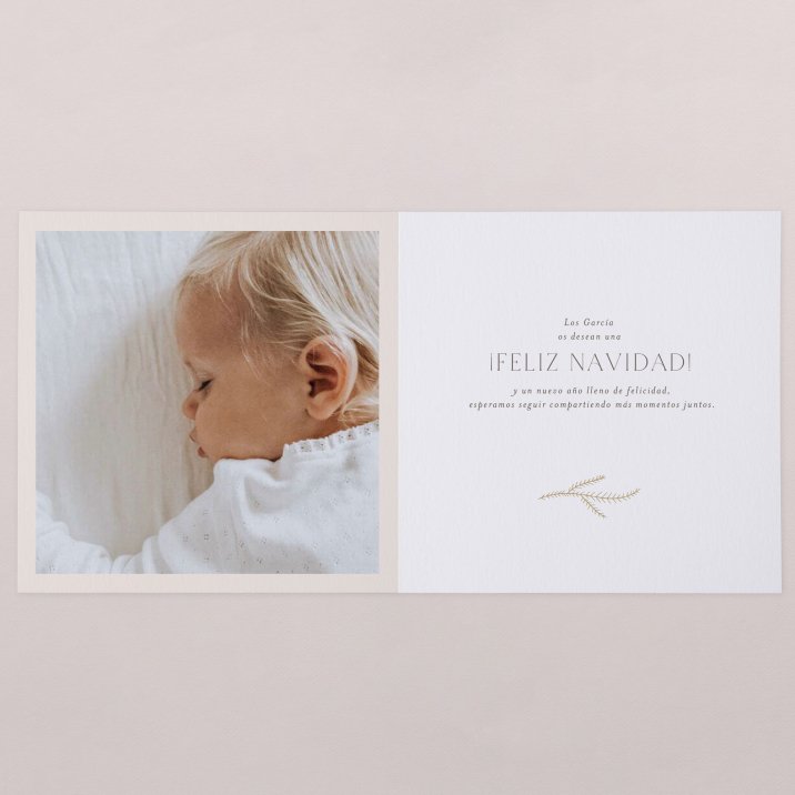 Vuestra mejor foto y la tipografía de acabado oro harán del modelo Gengibre una delicada manera de felicitar la Navidad y el año nuevo.