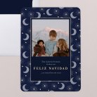 Déjate llevar por un paseo encantado en una noche estrellada de invierno... Sumerge a tus seres queridos en el ambiente festivo de las celebraciones de fin de año con la felicitación Vigil III. Delicadamente ilustrada con lunas crecientes y estrellas con acabados dorados, esta refinada tarjeta se complementa con tu mejor recuerdo.
