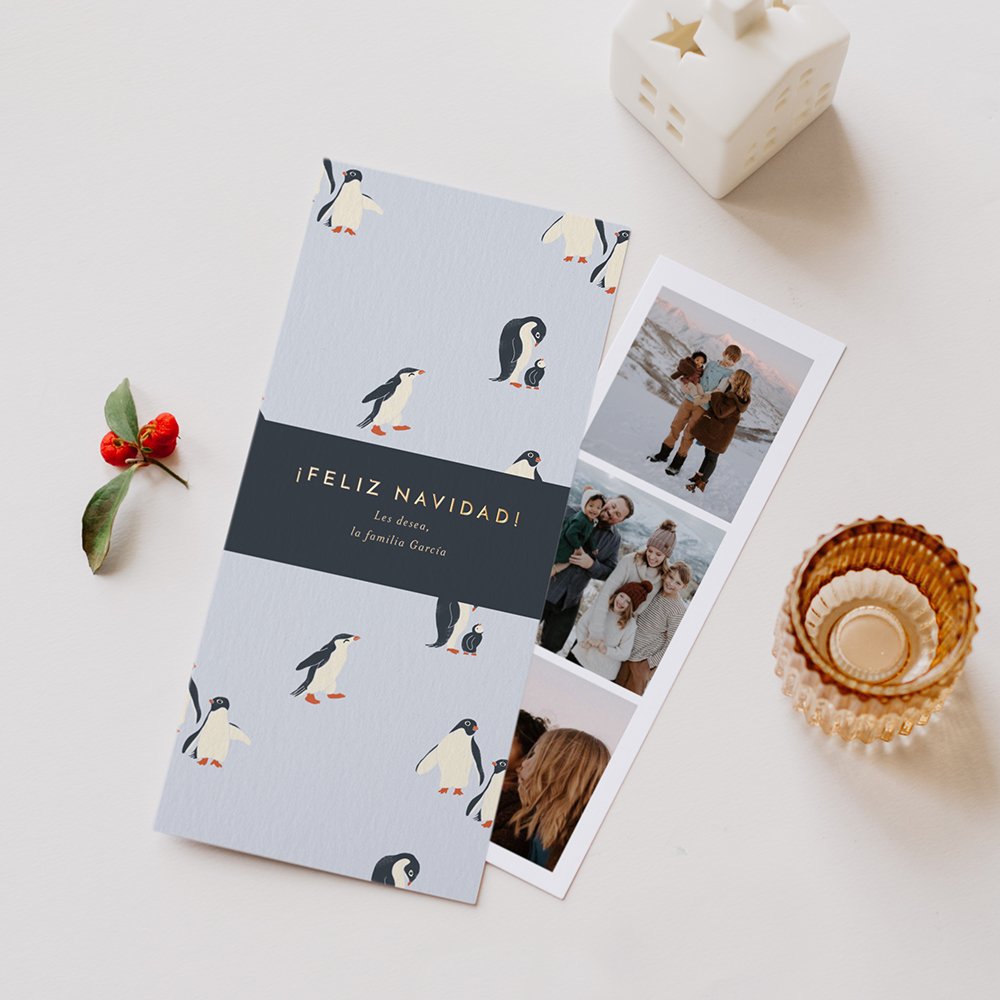 Envía una felicitación encantadora a tus amigos y familiares con la tarjeta On the Ice. Una adorable familia de pingüinos transmitirá tu mensaje con candidez y ternura. Un bonito ambiente polar decorado con la calidez y elegancia de su letra dorada.