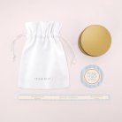 Nuestra vela dorada está fabricada en Francia. Presentada en una elegante caja de metal dorado personalizable, se entrega con su bonita bolsita de algodón e incluye dos etiquetas adhesivas, para que las personalices y pegues a tu gusto.