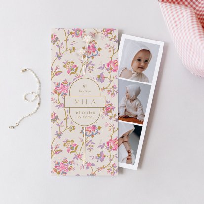 El primer paso es buscar la sección de invitaciones de bautizo para niña en el menú de Cotton Bird. Las opciones disponibles se dividen por estilos, por lo que te será más fácil quedarte con aquellas que reflejan mejor tu idea. Si quieres darle todo el protagonismo a tu hija, selecciona un modelo que incluya su fotografía.