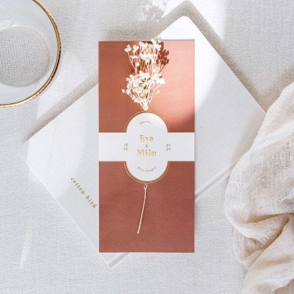 También te proponemos invitaciones minimalistas en forma de arco, como la del modelo Alcoba o Flavia; u otras con flores secas, como la del modelo Rosa Cadaqués. Algunos modelos presentan acabados de color cobre, como los del modelo Margot o los del Pollen. Ahora están muy de moda y quedan realmente fenomenal.
