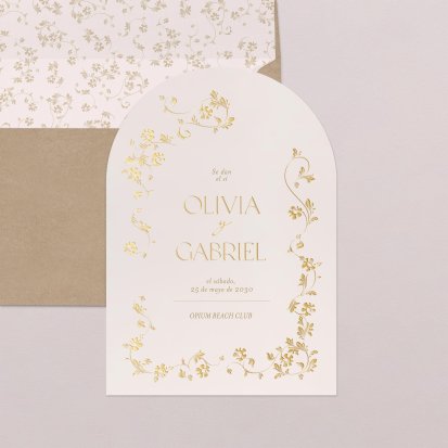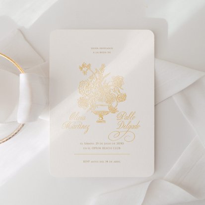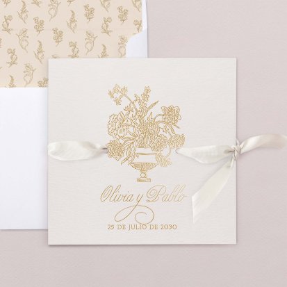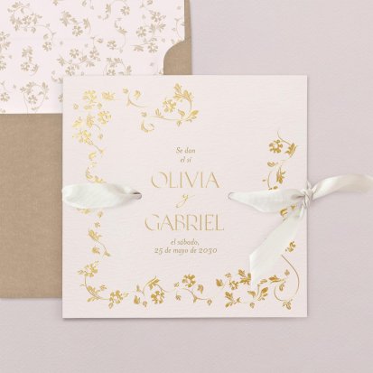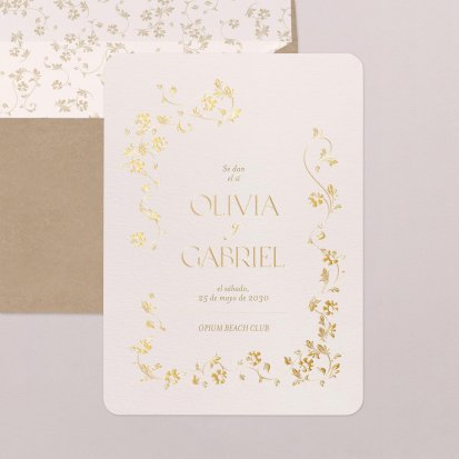 Adicionalmente, puedes conseguir un toque elegante y de sofisticación con las impresiones en relieve en oro o cobre sobre papel vegetal como las que consigues mediante los modelos Sauce y Verano, respectivamente. El tarjetón interno disimula la belleza del acabado. Solo cuando lo retiras puedes apreciar por contraste la sutileza de los apliques y la sencillez en el nombre o las iniciales de los contrayentes contra la transparencia de papel.