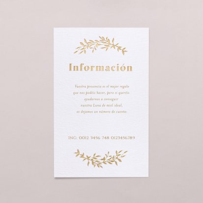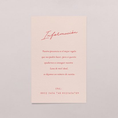 Facilita los regalos en efectivo para tu boda con nuestras elegantes tarjetas de número de cuenta. Simplifica el proceso de recibir donaciones y obsequios monetarios de tus invitados. Descubre nuestras tarjetas personalizables que agregan un toque de estilo y comodidad a tu gran día. ¡Haz que el compartir sea fácil y elegante con nuestras tarjetas de número de cuenta para bodas!